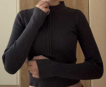 Красивый серый лонгслив в рубчик, есть молния, расстегивается до самого конца, и невысокое горлышко.